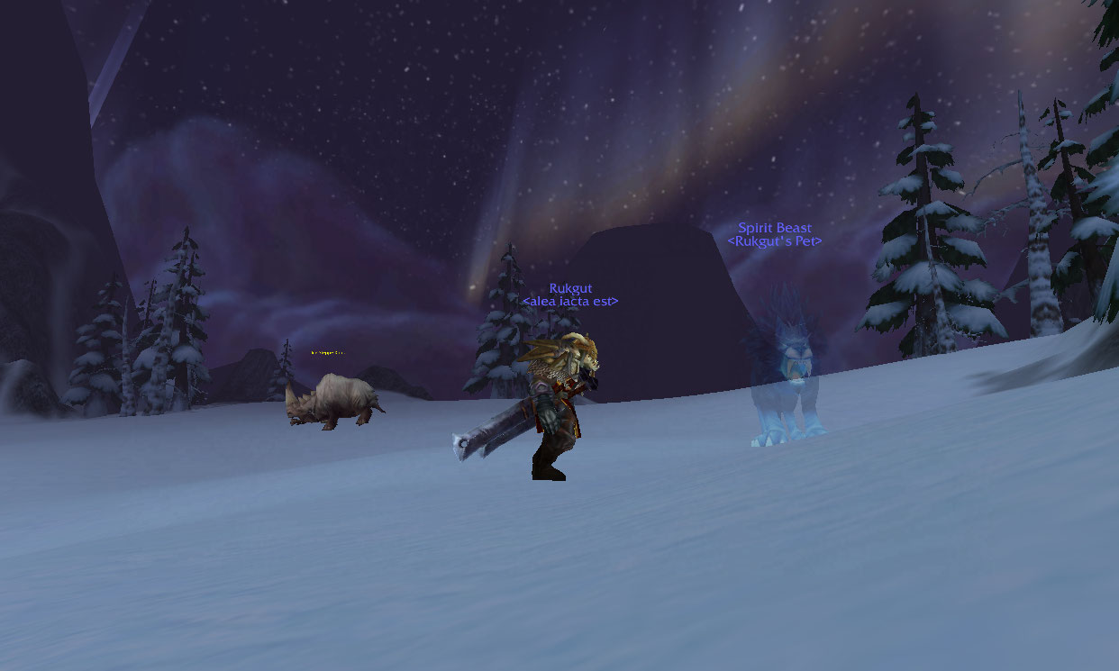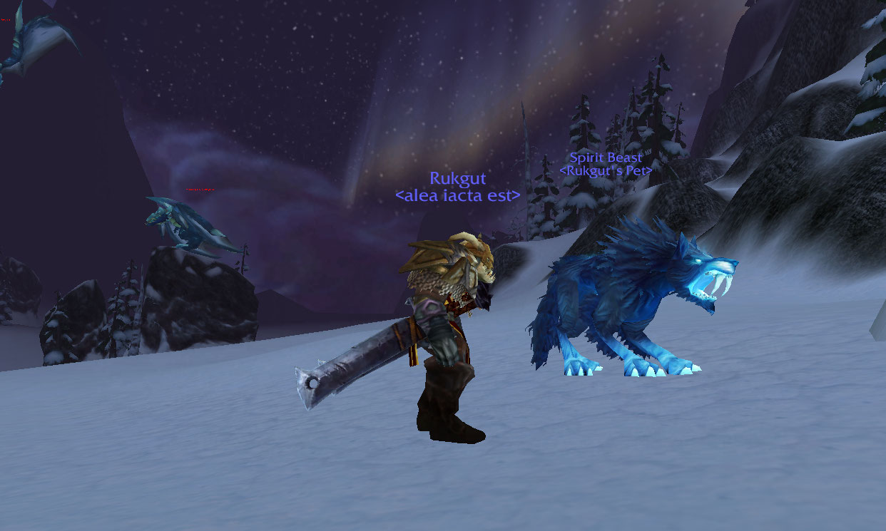 There was no gloating on our part. We simply took our new pet out for a walk, while I stood up from behind my keyboard and rode out the adrenaline dump from taming a rare pet that I’d spent months looking for (Spirit Beast, not necessarily this one.)