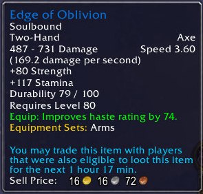 From that point on, I probably died five times. Two of those were on Boss fights, which were party wipes. There never seemed to be an issue with getting a rez when I solo died. When the party wiped, the Priest actually waited for me to zone in and ran back to the rest of the group with me. Nobody made any comments about the noob DPS Warrior. Nobody flashed a Recount result after a Boss fight. After all was said and done, my Warrior walked out with a new weapon: