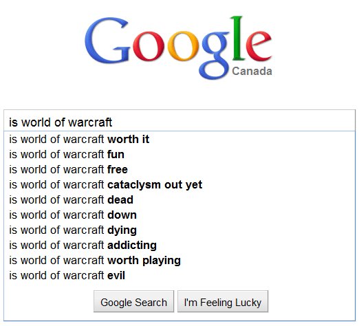 Google, flexing its mental muscle while further making people lazier than they already are, tries to auto complete your search query when you start typing in the search box. It shows you what the most popular questions asked of it regarding your topic, and this is where you get to peer into what is really on people’s mind. I typed in “Is World of Warcraft”, and this is what Google generated as the top ten queries: