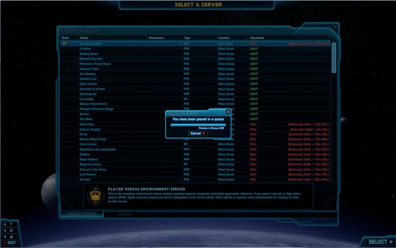 How does that work? If I’m in a queue, how does my wait continue to get longer? How, on the day after release, does Bioware think it’s a good idea to keep people waiting an hour to play their game? I understand that everyone is rushing to play, but at 9am? When WoW released Wrath of the Lich King during the holidays a couple of years ago, there were queue times during primetime hours. But WoW was an established title and Blizzard felt the players knew what they were getting. For a brand new title that should be trying to get as many people as they can investing their time in the game, a 9am queue comes off as bad form.