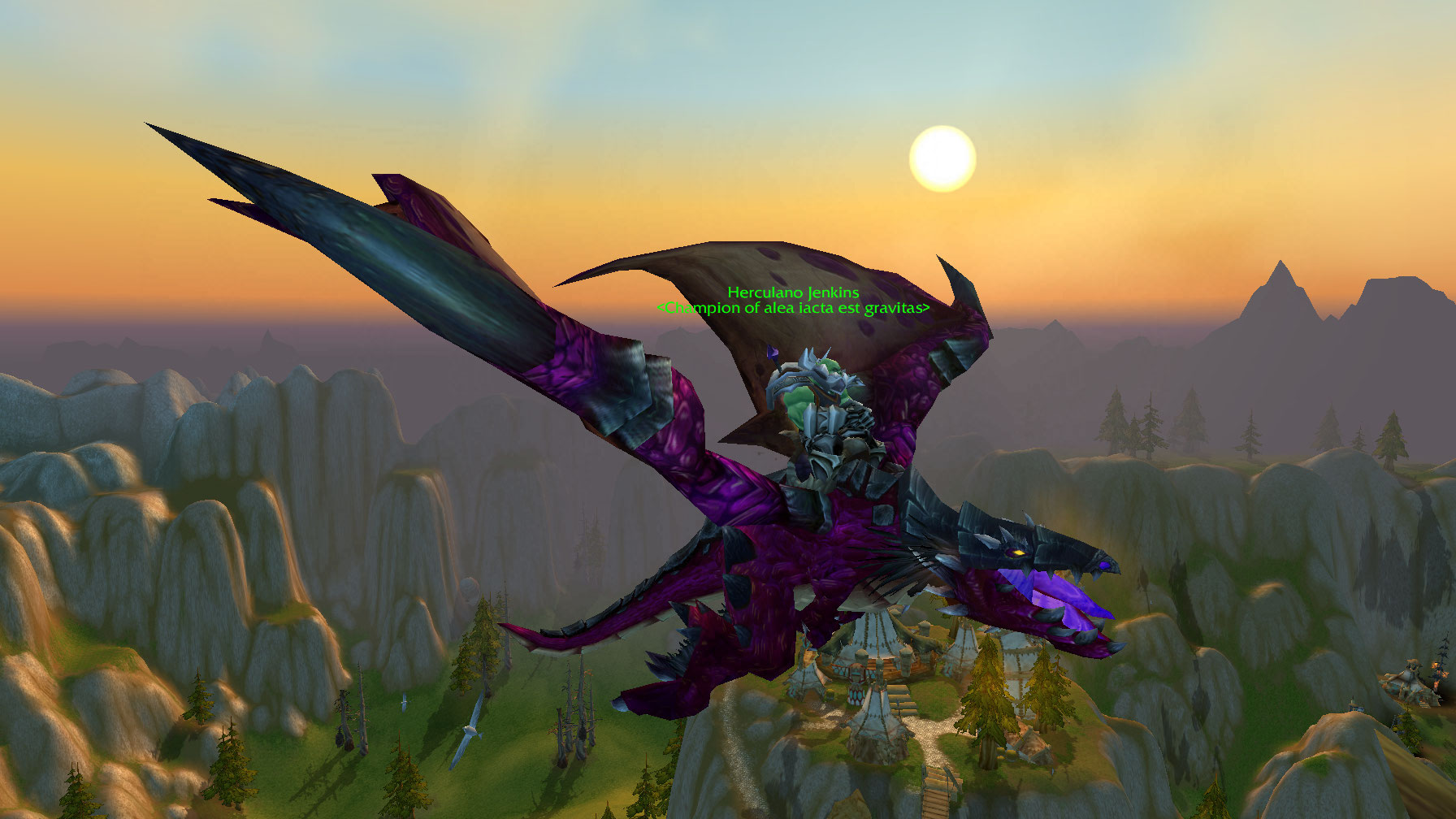 That, as you might have noticed, is a purple proto-drake. You obtain said creature by completing the Meta Achievement What A Long, Strange Trip It’s Been. That’s right, you too can fly Barney the Dinosaur if you complete a few (like, just about all) of the World Event Achievements.