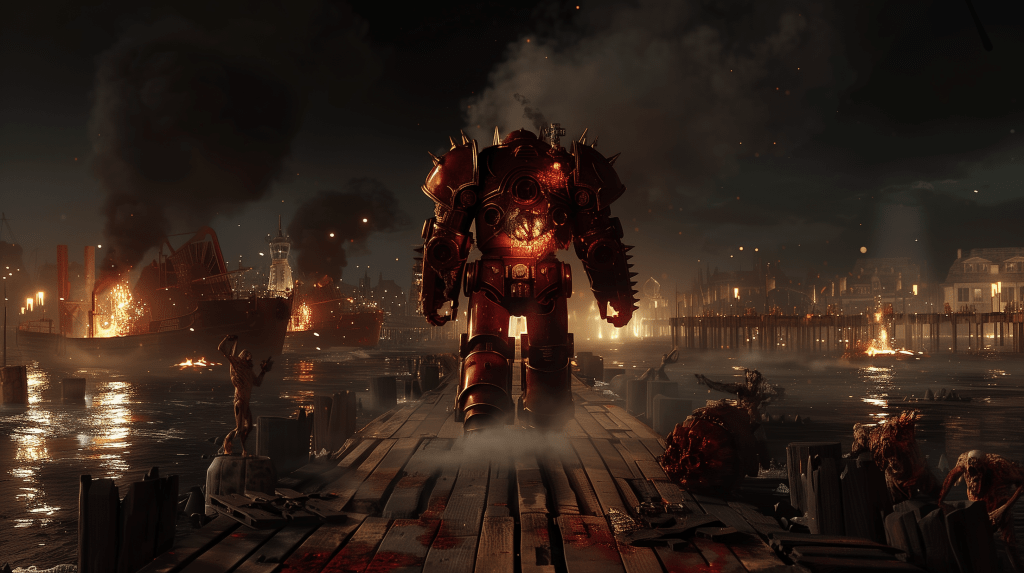 Captain Joseph Lorune stood at the edge of the pier, encased in the damaged Mighty Maiden, a prototype suit of steam-driven armor. Once, it had been a symbol of magical ingenuity. Now it was a coffin on legs. The suit hissed and leaked smoke. Lorune’s voice, barely audible through the voice-horn, cracked with command and panic.