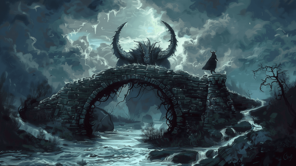 As darkness descended and the Sandfly approached a massive stone bridge, what seemed like a routine passage turned into an ambush. Two Ebon Triad cultists emerged from the shadows, raining necrotic bolts upon the party from their vantage point. The situation grew dire with the appearance of a familiar foe – Arnyx, the bearded devil now bearing the burned symbol of the Ebon Triad on his chest, demanding the head of the Ebon Triad High Council member, Voragon Drakon, which the heroes had in their possession. The combat escalated further when a Seer, a disturbing figure with skin writing from worms crawling beneath it, joined the assault with unusual – and devastating – psychic attacks.