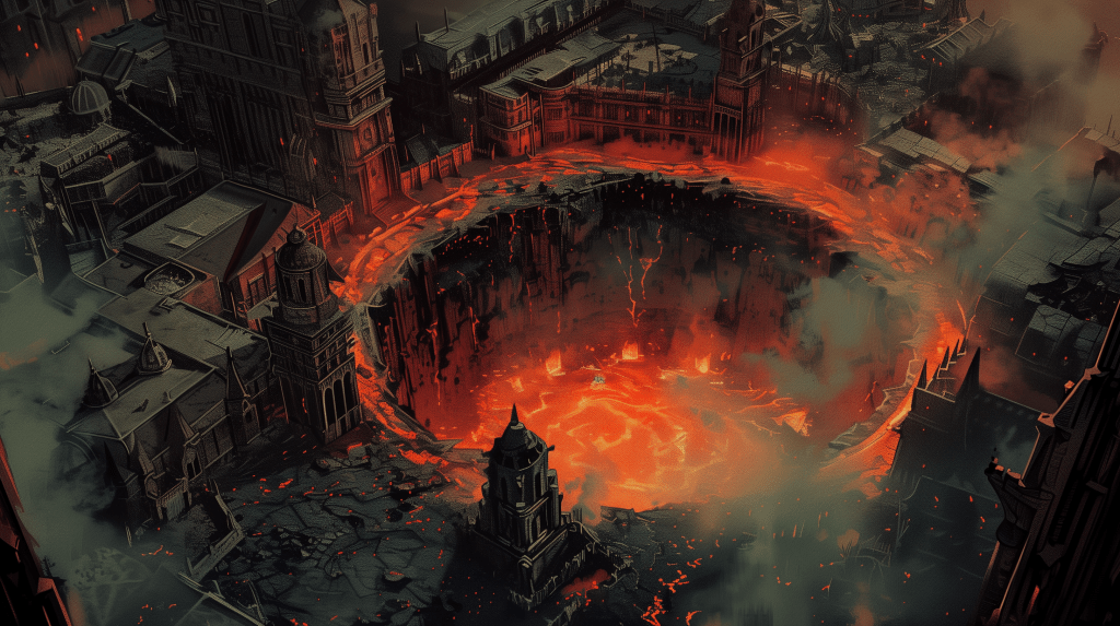 A crater, 500 feet wide, hissed with steam. Red-hot stones. Ash in the wind. Smoke curled upward from the ruins. The church had vanished, consumed by hellfire. And with it, their plan.