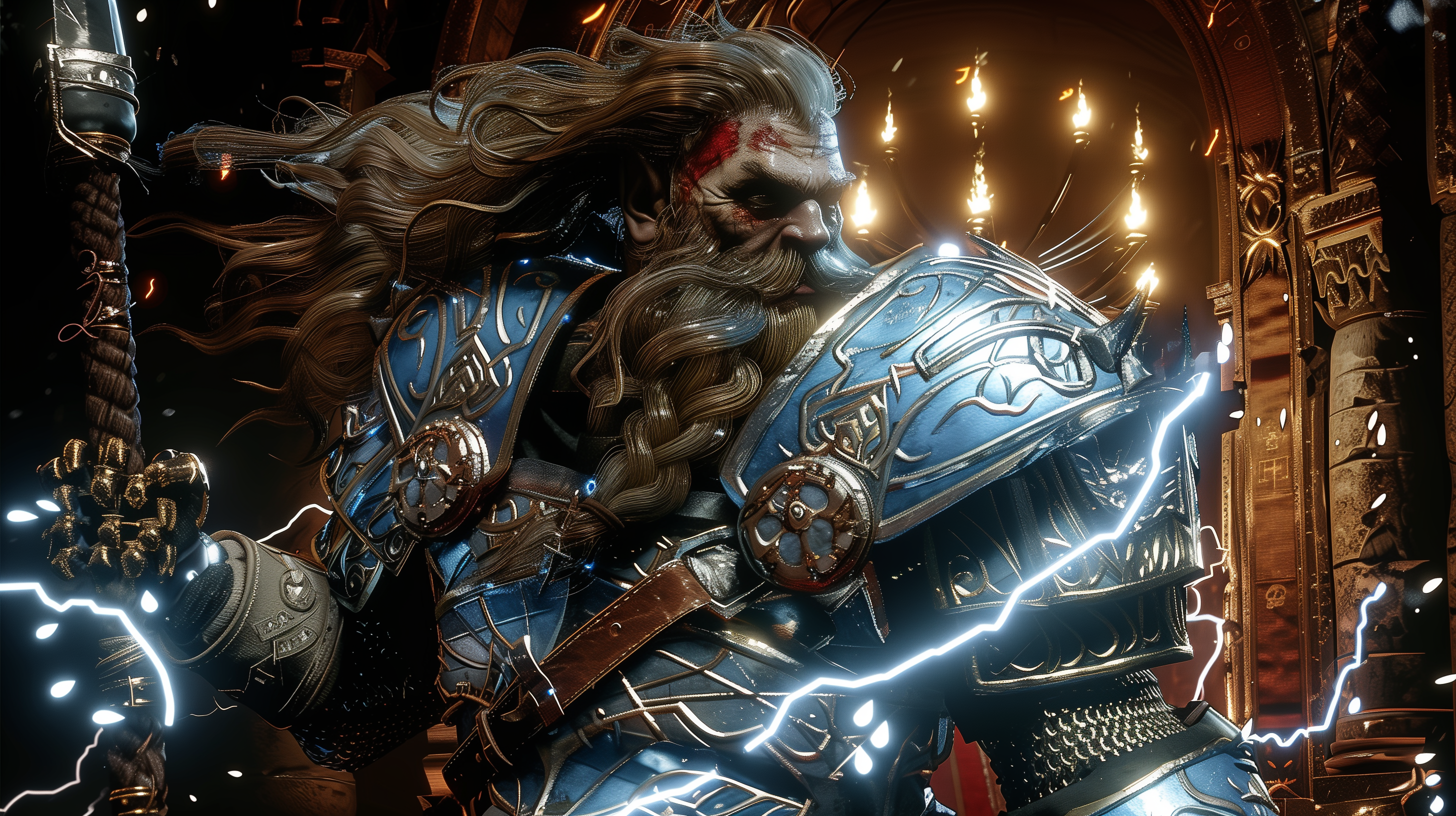 Dunner didn’t fall easy. His armor was scorched black from Jylen’s infernal blast, smoke rising from the cracks in the plates, but he stood anyway—shield up, jaw clenched, eyes locked on the thing that used to be Zalrynn. When the storm came—lightning flashing, rotting fists hammering down—Dunner didn’t flinch. He planted his boots in the blood-slick stone, braced for the hit he knew he couldn’t survive, and made himself a wall.