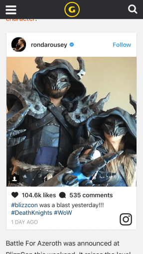 I’ve mentioned in the past that the former UFC Women’s Bantamweight Champion-turned actress/WWE hopeful, was also a World of Warcraft player. Turns out, Ms Rousey also loves her some Blizzcon. She and her husband, former UFC Heavyweight contender and all-around man-beast, Travis Brown, appropriately dressed as Death Knights and came to Blizzcon 2017 to check out the new expansion, Battle for Azeroth.