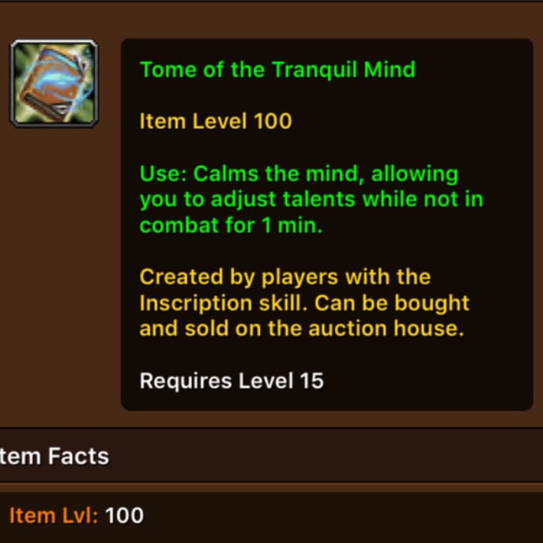 Yep, Tome of the Tranquil Mind. The consumable that you have to use when you want to swap specs. Without it, you have to be somewhere in a rested XP area (city, inn) to make the change. A beneficial item to have for raiding, running dungeons, or hell even for questing.