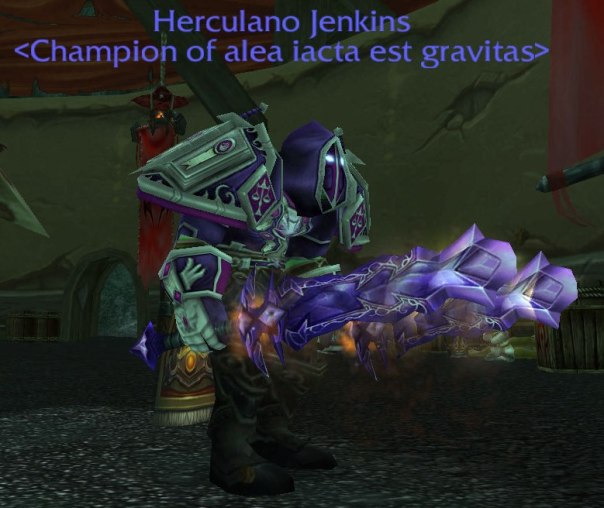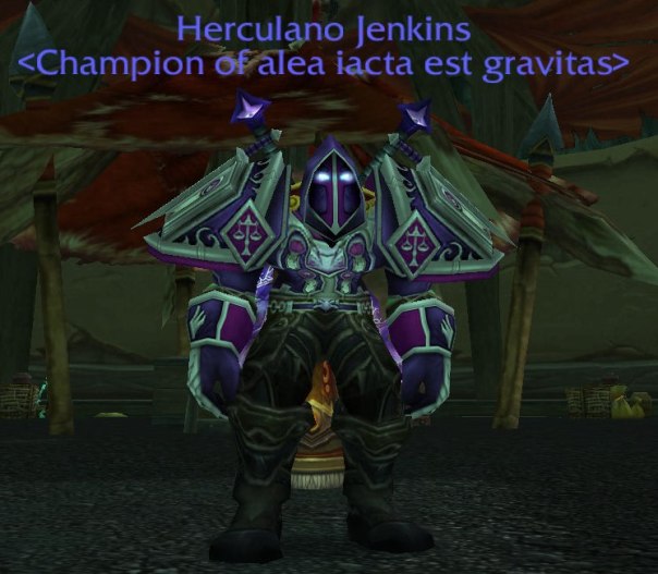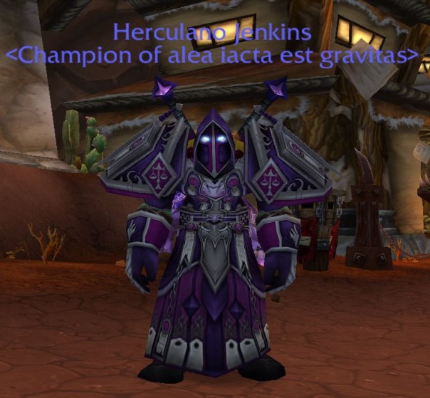 I guess I picked this Judgement armor because it looked like a super hero costume. Like Spider-Man with knives on his shoulders. But whatever, it’s Outland Heroic dungeons which means lockout, which means it takes some time to assemble the gear.