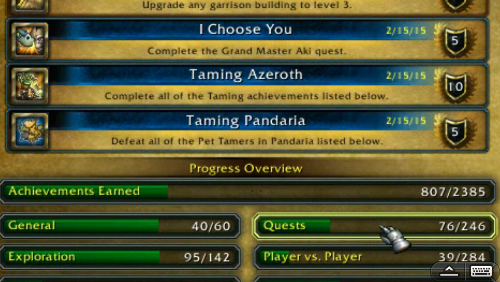 With all that goodness behind him, he’s almost at level 91. You’d think he’d be more than ready for Draenor. He is, of course, but there’s still a few more achievements to get in Azeroth. Might as well clean up those loose ends before heading to another planet to start trouble (with their battle pets and tamers). Mind you, if he’s sticking around, he should get as much xp as he can. Like, by running the Pandaren Tamer dailies in his spare time.
