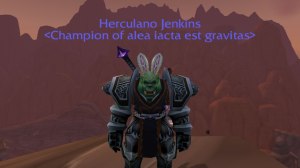 The first title <Name> “the Patient” was one I wasn’t even consciously trying to get. I was running an endless stream of Hour of Twilight PUGs, and just got the title. It was a side-effect of running too many PUGs, but unlike lowered self-esteem and hemorrhoids this was actually a side-effect worth getting.